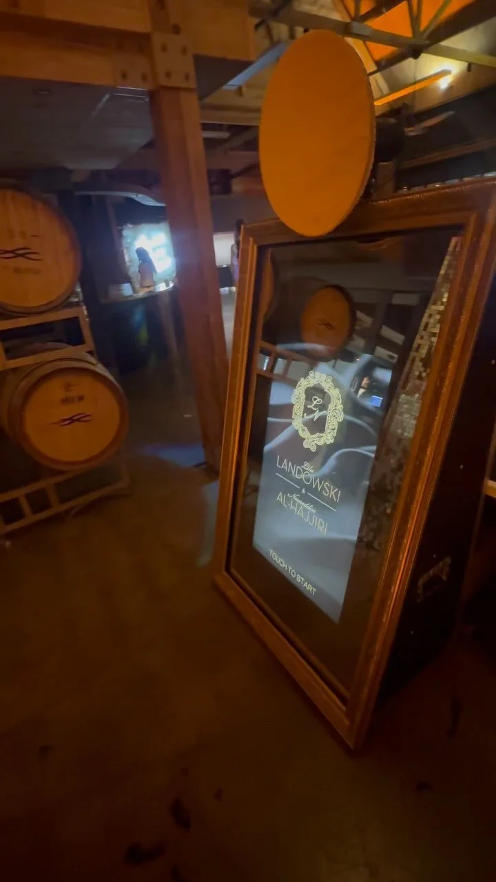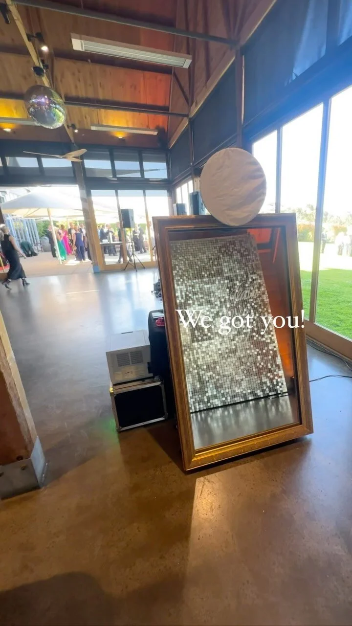 Golden Framed Mirror Photo Booth: Elevate the glamour at your event with our golden framed mirror photo booth, adding a touch of luxury and sophistication to your sessions.